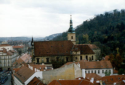 Pohled na kostel u P. M. Vítězné v Karmelitské ulici z věže Sv. Mikuláše, na kostel, který proslavilo Pražské Jezulátko a pod kterým jsou nejrozsáhlejší pražské krypty. Foto: © Vladimír Vojíř |
