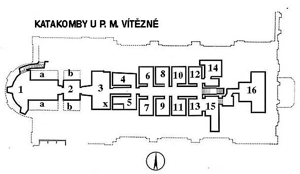 1 = vstupní kaple a = ve stěnách jsou sklípky s uloženými rakvemi 2 = druhá komora, kde "b" značí stěny s uloženými rakvemi ve vyzděných sklípcích 3 = největší komora s uloženými rakvemi, v místě označeném "x" je vyzděný stupeň s krycí deskou, je to hrob Polyxeny z Lobkovic 4, 5, 6….až 16 jsou označení komor krypty.