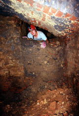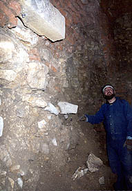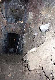 tohoto snímku. Mimo prostory barokní jsme zde měli možnost provádět průzkum i ve štoličkách daleko starších, např. v románském vodovodu, z něhož byly některé části v průběhu staletí upravovány a různě přezdívány. Např. na dalším snímku je ústí vyzděné chodbičky někdy před cca sto lety, která navazuje na bývalý románský vodovod.Průleznost těchto objektů je dosti obtížná. Prakticky jsme provedli průzkum a vyklizení všech hlavních podzemních chodeb v objektu kláštera na Strahově.