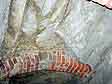 Opět se dostáváme vstupní ukloněnou části do úrovně těžených vrstev. V první pravé odbočce nás upoutají masivní “I” profily, na kterých sedí základ povrchové stavby, který se dostal do podzemí a stavebník použil tohoto řešení, než aby se spokojil s menší plochou stavby. |