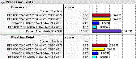 These results are from my tests and the Results folder in the MacBench folder. As you can see the PF G3/240 has a faster processor but performs slower than the G3/233 Desktop and the iMac. The reason is probably because of the bus speed. The other G3's have a 66 mhz bus while the Performa has a 40 mhz bus. But hey, the Vimage card is about equal in speed with a 604e/300 mhz chip.