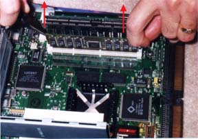 Unlike the RAM, there is no little lever to help lift out the card :( To remove the L2 cache I use a pair of pliers on one side and my fingers on the other side and lift up. A little rocking back-and-forth might help to as it is in very tight.