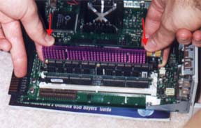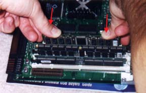 To install the L2 cache card just align the notches in the slot and put equal pressure on both ends at the same time. DO NOT put force which may bend the card sideways or you may damage the card or worse, your mother board cache slot! You will know when the card is installed properly when you hear a loud CLICK.