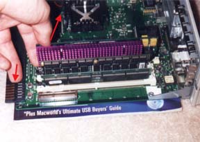 The G3 cards install in the same manner as L2 cache cards. Just align the notches in the slot and put equal pressure on both ends at the same time. Again, DO NOT put force which may bend the card sideways or you may damage the card or worse, your mother board cache slot! You will know when the card is installed properly when you hear a loud CLICK.