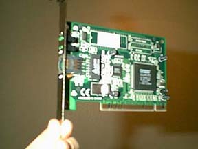 This is a what a typical PCI card looks like. This one happens to be a Farallon PCI 10/100 Fast Ethernet card. Notice where I am holding the card. This is a good place to hold a PCI card until its time to place it in the Mac.