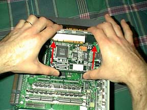 With the connector lined up with the slot grab the PCI riser card and the back edge of the new PCI card and squeeze the two together. It will make a loud snap when in place. Sometimes the PCI card does not fit just right and you have to work it towards the PCI cover a bit. The cover has little spring pieces of metal sticking out of it to put force on the card when installed. This might cause some PCI cards to have a bit of trouble lining up the connector. You will know when the card is installed properly when you hear a loud CLICK.