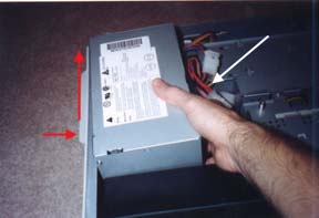 With the screws removed you can now lift out the supply. I find it easier to do with the case lying on its right side. First move it to the front of the case about 1/4" as there is a lip it is under in the rear. Then lift up taking care not to damage the cables (white arrow). They will get pinched as it is a tight fit, so do this slowly!