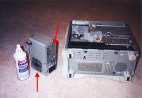 With the supply removed you can either replace it or clean it with some dust remover spray. I got this can from Radio Shack. Just spray the air in the vent and fan opening.