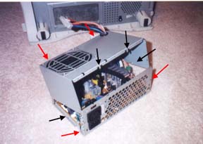 If you wish to go further you can open the supply by removing the 4 screws (red arrows) located around the supply. When reinserting the pieces make sure the tabs (black arrows) are seated properly.