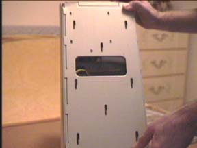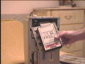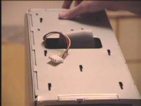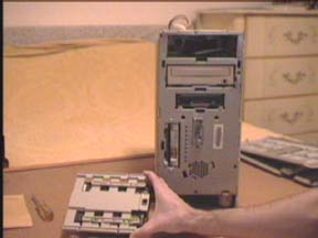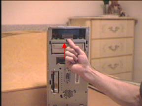This page assumes a drive is present in your upper bay. If not then follow it in reverse to install a new drive. You can install any 5.25" or 3.5" drive in this bay. There are only bezels for Zip or Jazz sized drives though. A CD-ROM will fit but you will not be able to use a front bezel without cutting it to allow access to the CD tray.