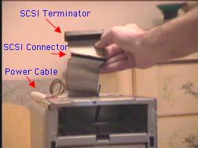 With the drive removed you can see the entire SCSI cable end. At the very end is the terminator for the internal chain. DO NOT REMOVE this as it will cause you lots of problems without proper termination.