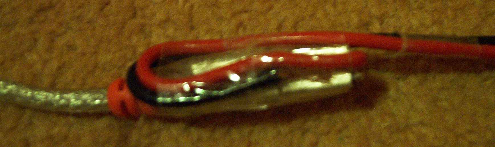 2) You have to strip 0.7mm of the red wire and turn the bare end while holding the other end still to wind the fibres together. Bend the bare wire back over the insulated part of the wire. Then put the wire into the connector, MAKING SURE IT IS NOT TOUCHING THE OUTSIDE OF THE CONNECTOR OR ANY OF THE OTHER PRONGS! You may severely damage your MacÕs circuitry if the wires touch! Your connector/cable should now look somthing like this: